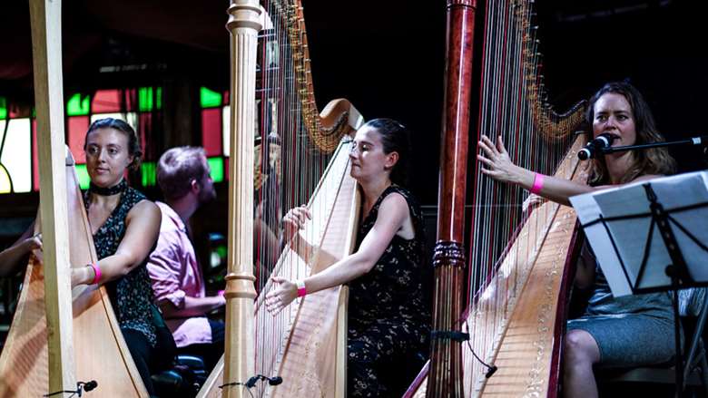 The 'MJF originals' are a lifeline to artistry, like most music festival commissions, and this year they handed the chance to Esther Swift (pictured far right) to entwine her folk, classical and jazz roots with a statement ensemble of strings, brass, piano, drums and four harps.
